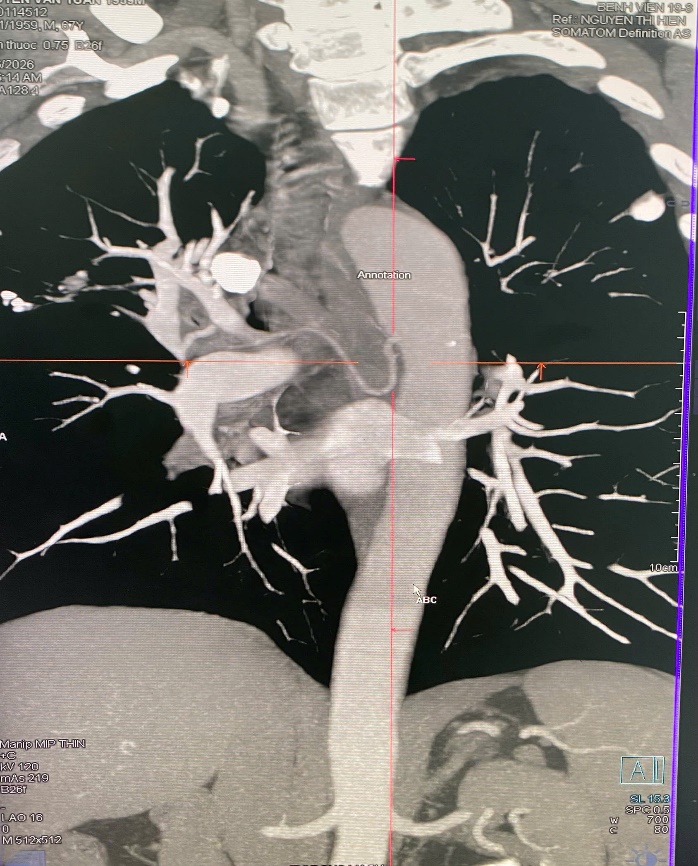 Ngày 25/02, bệnh nhân nhập viện tại Bệnh viện 19-8 để thăm khám và điều trị. Qua thăm khám lâm sàng, kết hợp các phương tiện chẩn đoán hình ảnh hiện đại, các bác sĩ phát hiện bệnh nhân bị giãn động mạch phế quản bên phải – nguyên nhân trực tiếp gây tình trạng ho máu kéo dài.