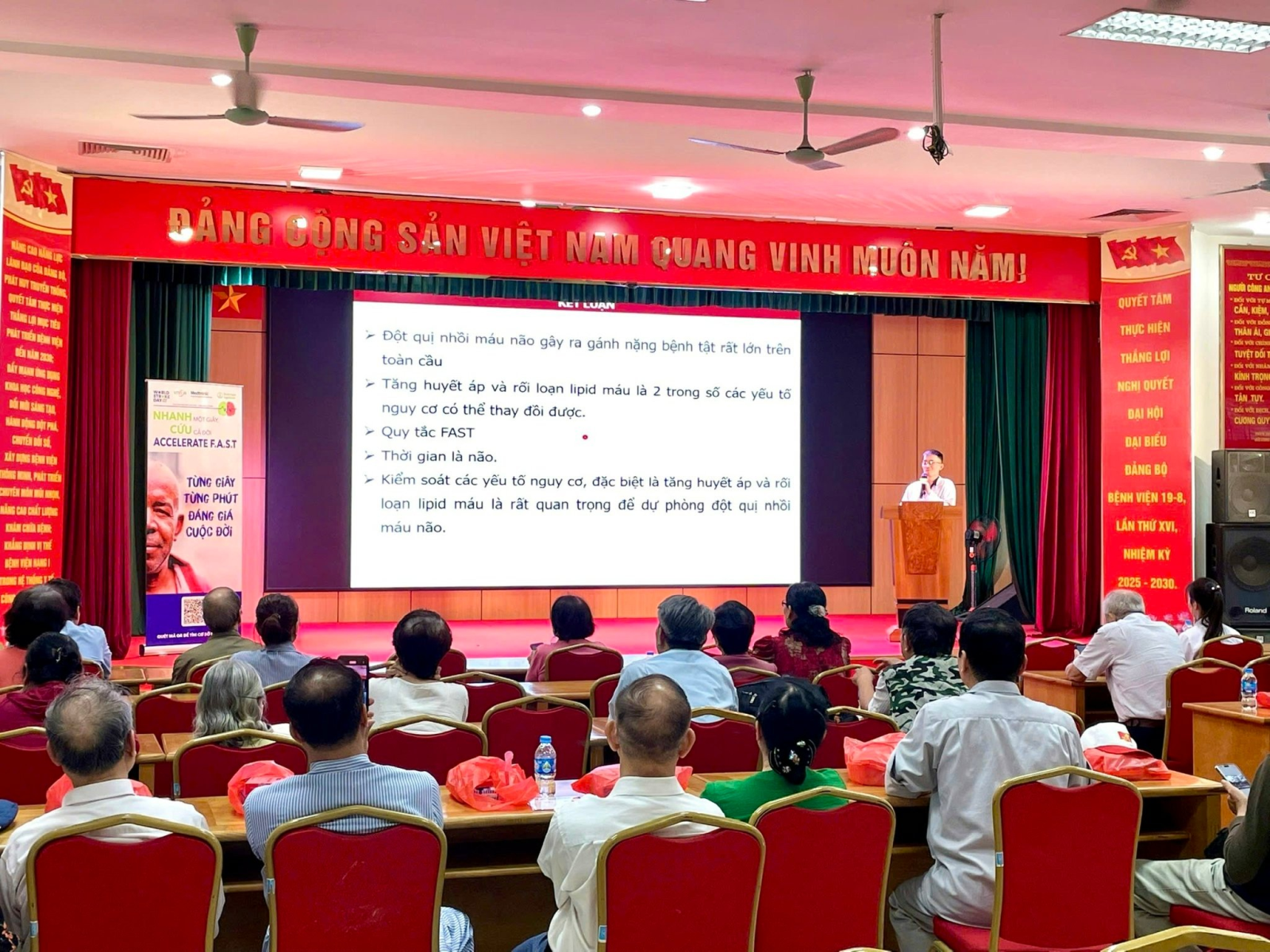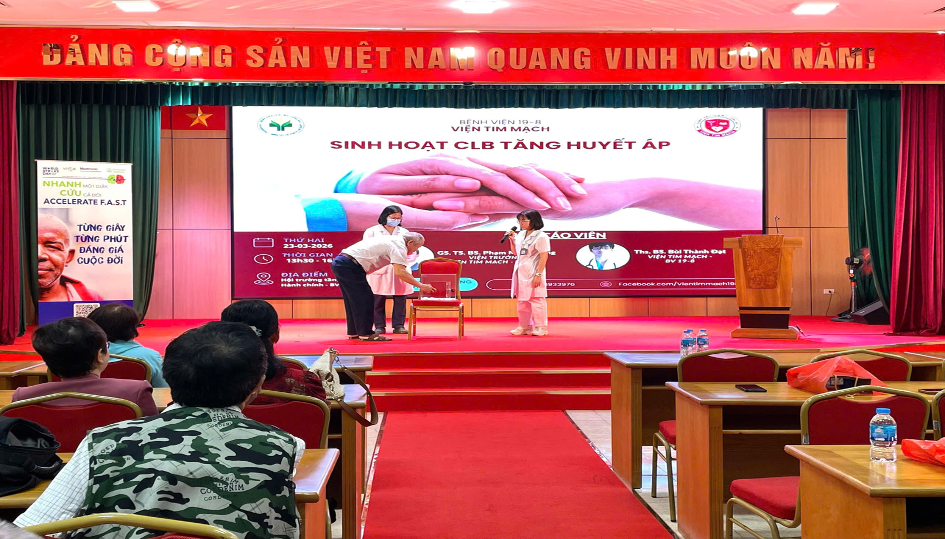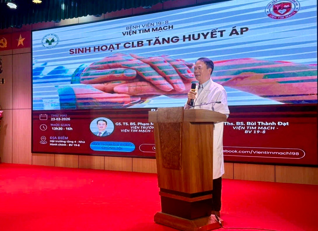 Nhằm nâng cao nhận thức và kỹ năng phòng ngừa bệnh cho cộng đồng, chiều ngày 23/03/2026, Viện Tim mạch – Bệnh viện 19-8 đã tổ chức thành công buổi sinh hoạt Câu lạc bộ Tăng huyết áp tại hội trường tầng 4, nhà hành chính với chủ đề: