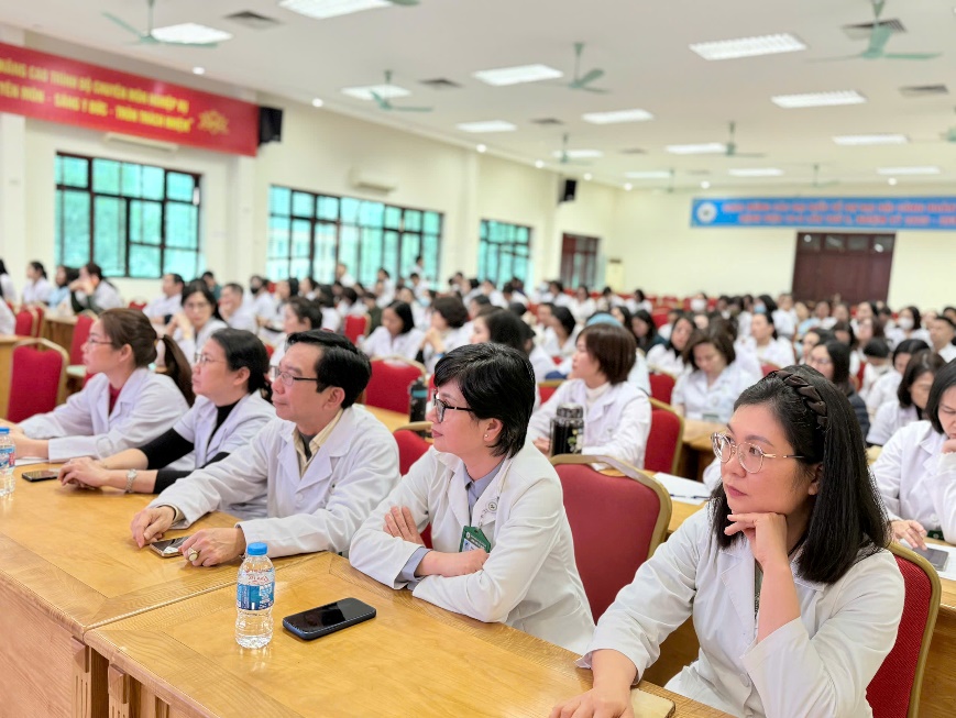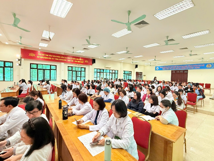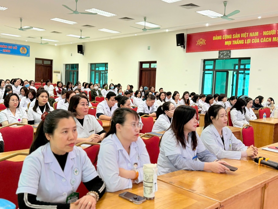 Lãnh đạo các khoa, phòng, trung tâm, điều dưỡng trưởng và đông đảo cán bộ, chiến sĩ, nhân viên y tế trong toàn bệnh viện tham dự buổi tập huấn