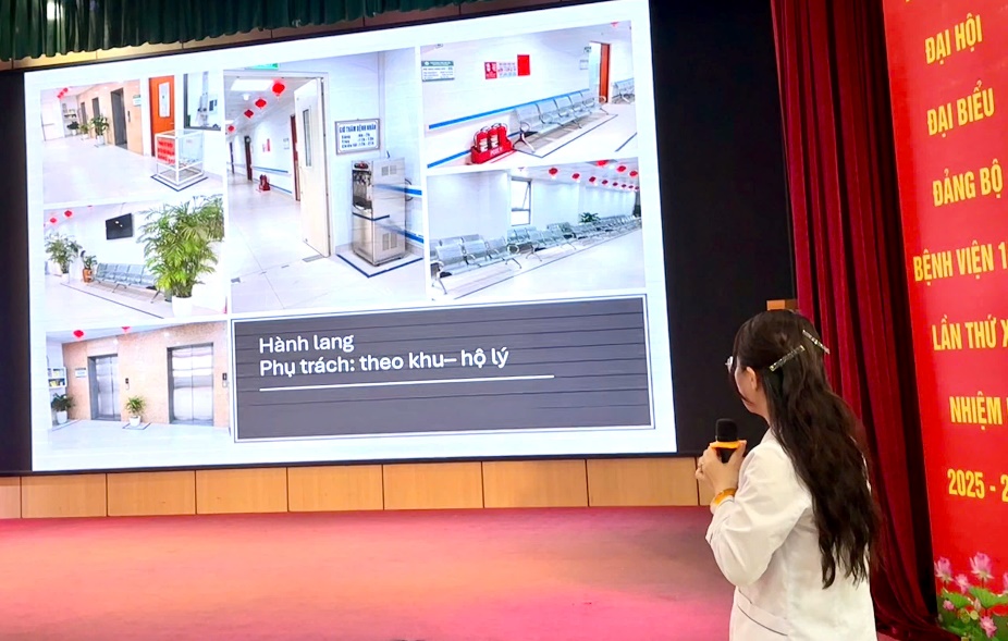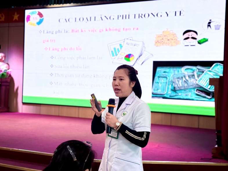 Tiếp nối chương trình, đồng chí ThS Đoàn Thanh Loan – Điều dưỡng trưởng Khoa Ngoại Tổng hợp đã chia sẻ kinh nghiệm thực tiễn trong quá trình triển khai 5S tại khoa, tập trung vào các giải pháp cụ thể như phân loại, sắp xếp, chuẩn hóa dụng cụ – trang thiết bị, xây dựng quy định trực quan và duy trì thói quen 5S gắn với hoạt động chuyên môn hằng ngày. Những kinh nghiệm thực tế này đã giúp các khoa, phòng có cái nhìn rõ ràng hơn về cách triển khai 5S phù hợp với đặc thù chuyên môn.